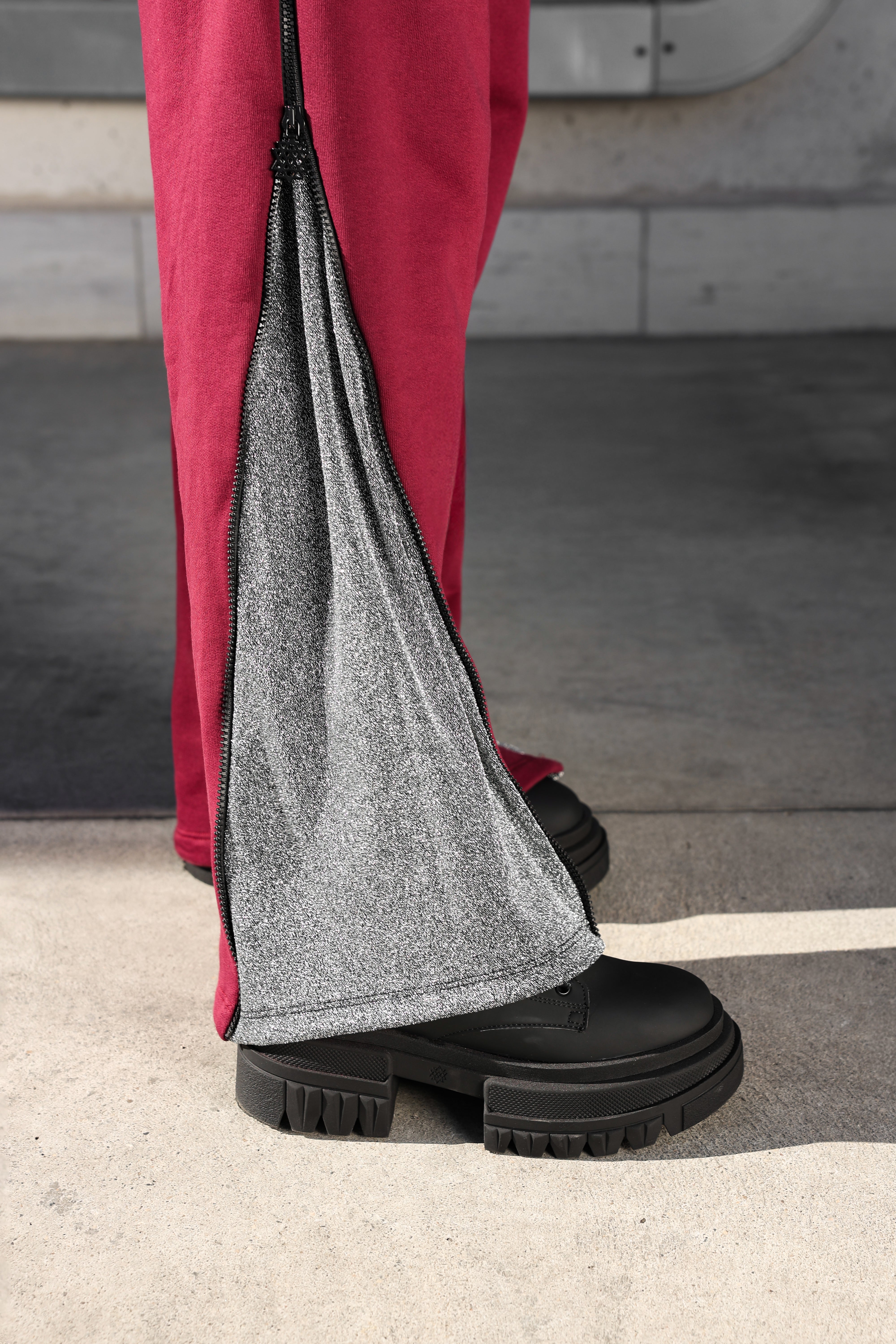 Ce pantalon ample et confortable est doté d'une ceinture à cordon ajustable , conçue pour un ajustement parfait. Son détail distinctif réside dans la fermeture éclair latérale qui, une fois ouverte, révèle un empiècement intérieur en lurex argenté , un effet spectaculaire qui rend cette combinaison unique et immédiatement reconnaissable.