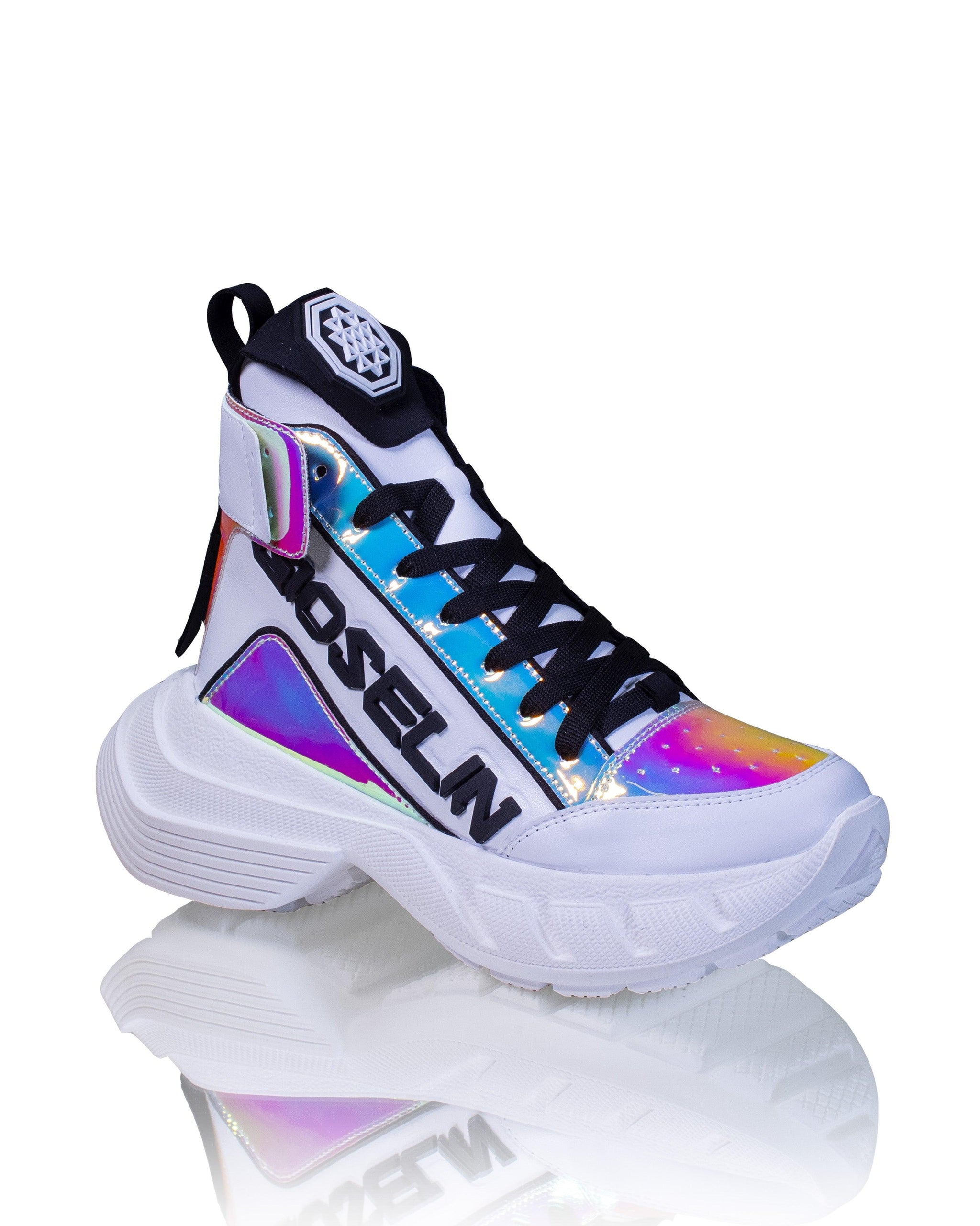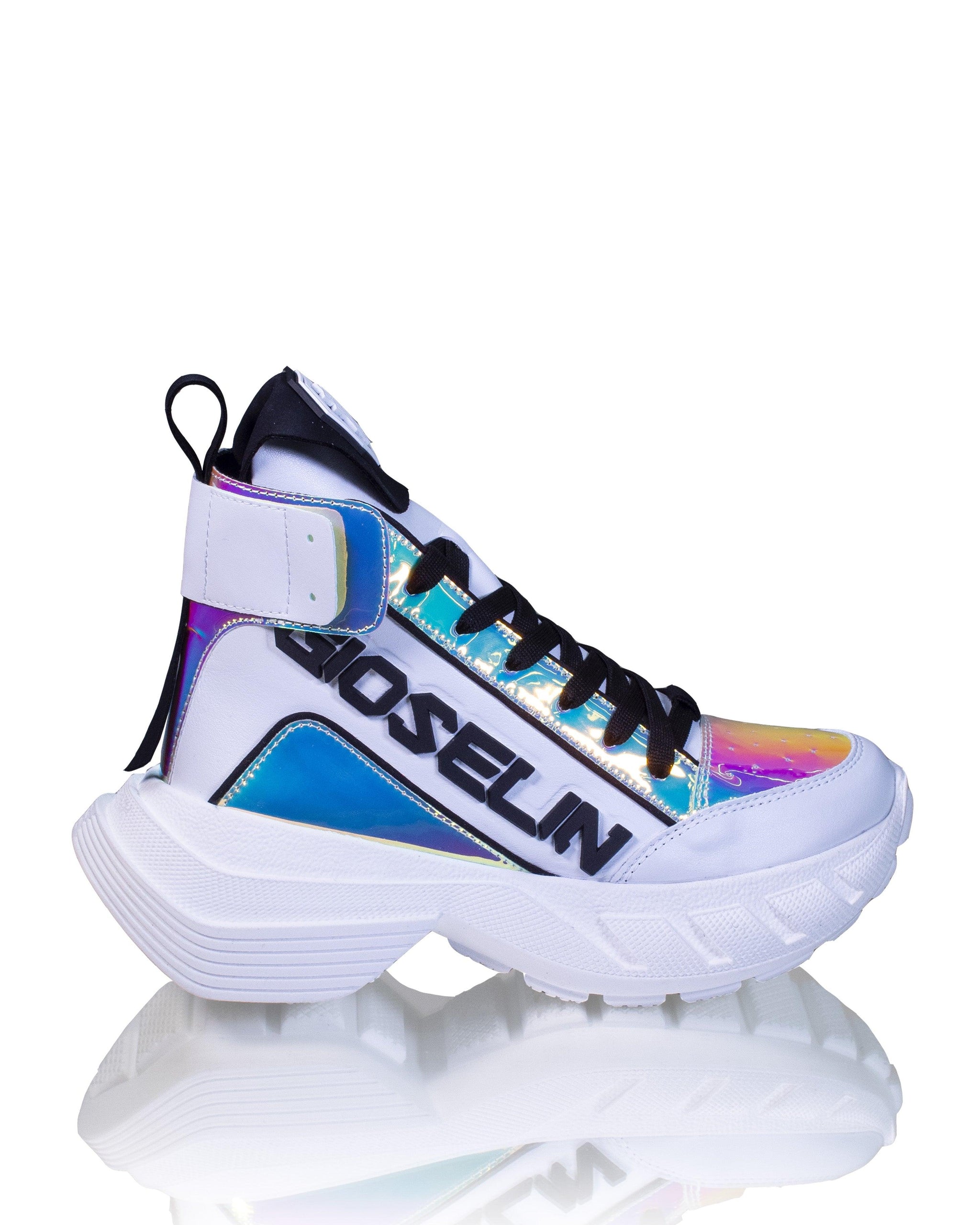 Les baskets aux détails irisés sont le choix idéal pour celles qui recherchent une touche de luminosité dans leur style. Ces baskets présentent un profil haut qui ajoute une touche d'élégance à votre look. Le modèle est lacé pour un ajustement sûr et confortable tout au long de la journée. Les panneaux contrastés irisés ajoutent une touche d'originalité au design, capturant la lumière de manière fascinante.