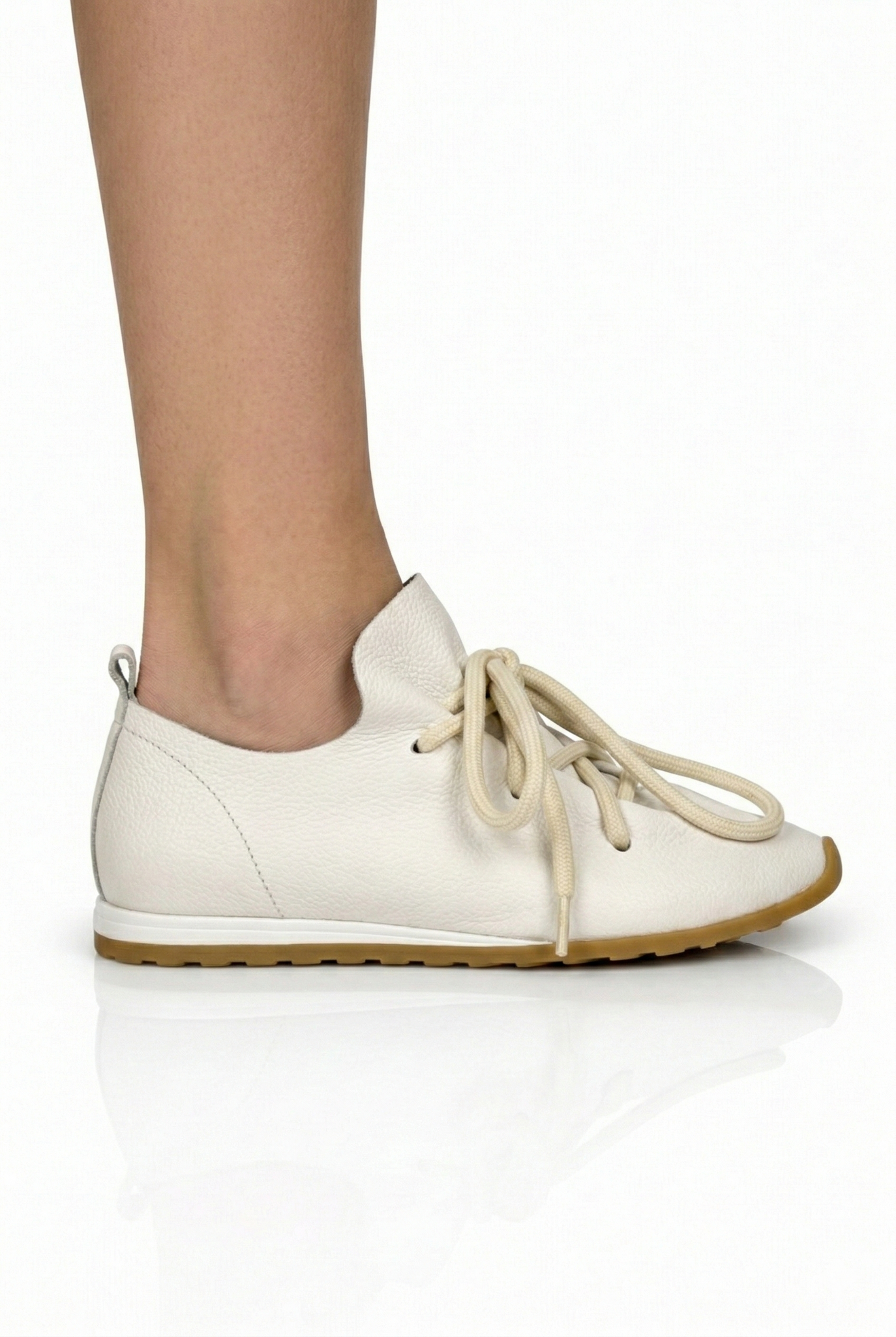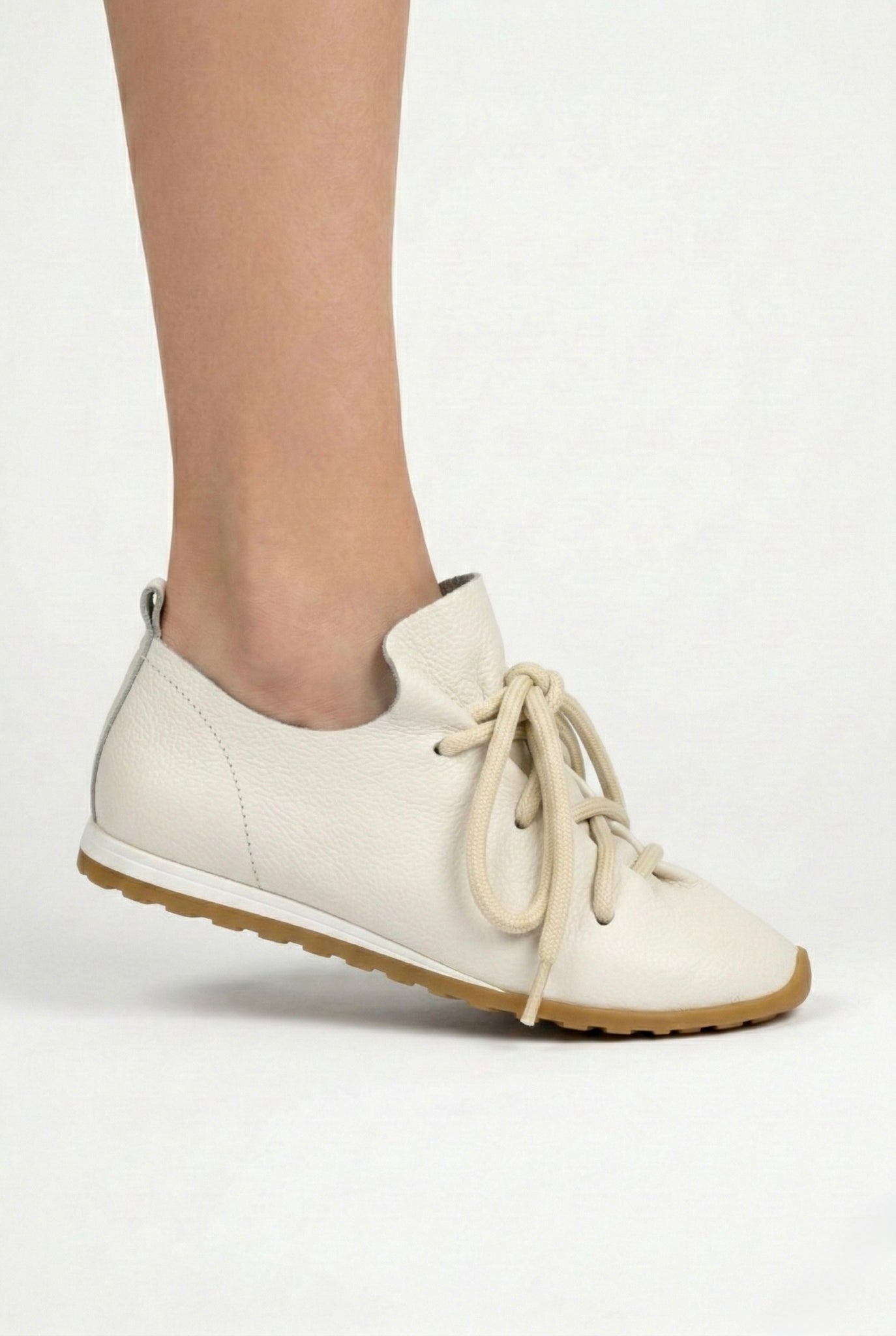 La tomaia morbida e naturale valorizza la texture della pelle attraverso leggere ondulazioni che creano un raffinato gioco di volumi, donando movimento e profondità alla silhouette. Il design essenziale è arricchito da lacci morbidi e strutturati che introducono un dettaglio distintivo, mantenendo un perfetto equilibrio tra semplicità e ricercatezza.