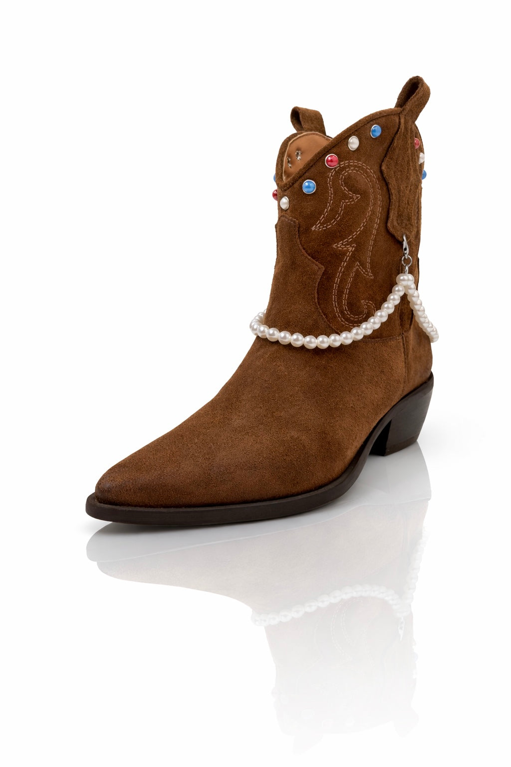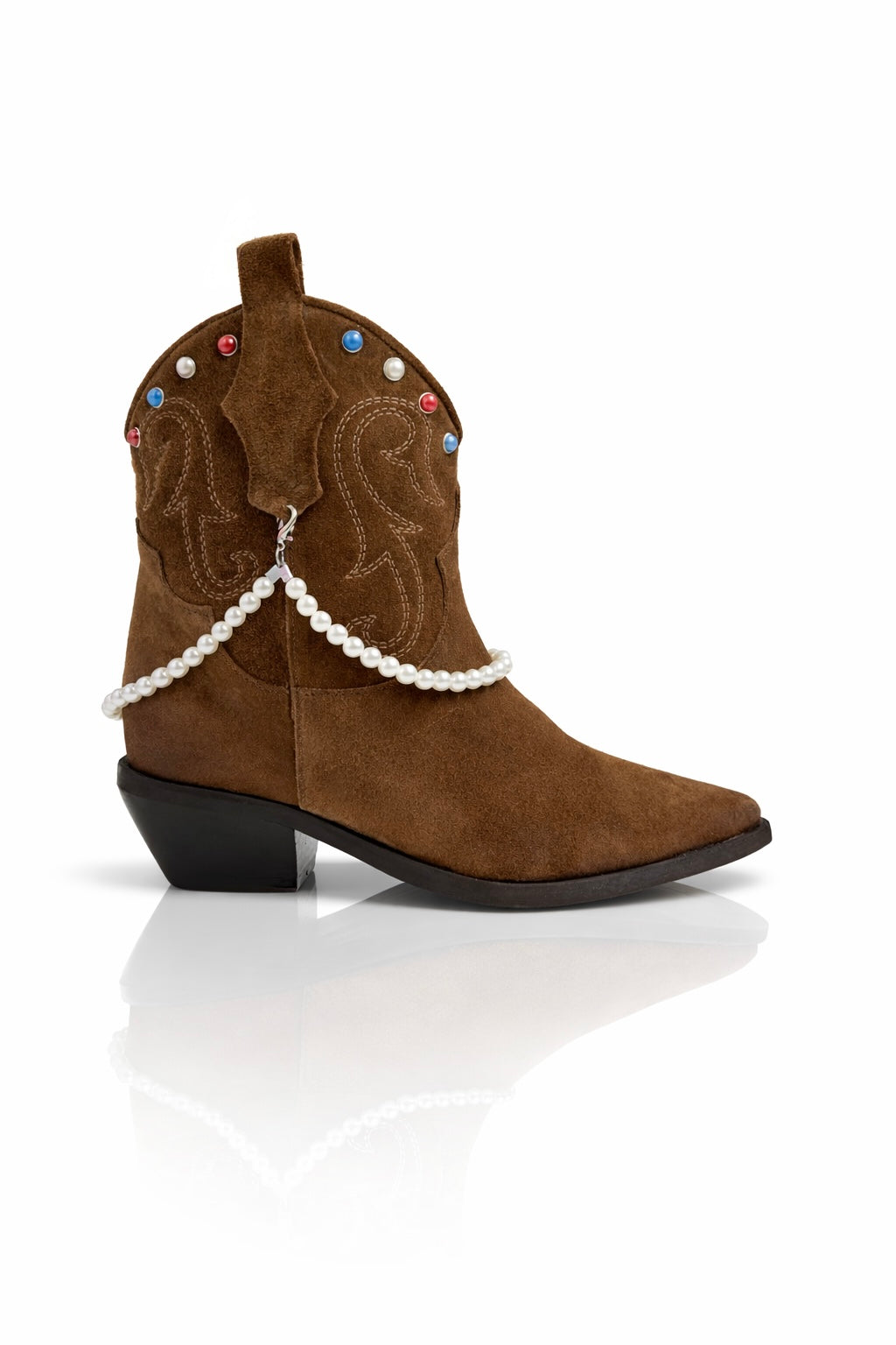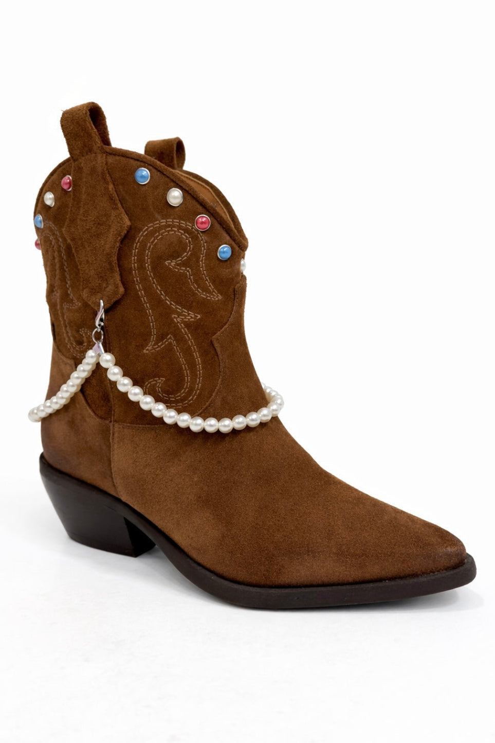 Il vero elemento distintivo è la catena di perle removibile, applicata lateralmente e avvolta delicatamente intorno alla tomaia. Questo dettaglio aggiunge un tocco femminile e prezioso allo stile western, trasformando lo stivale in un accessorio fashion capace di elevare qualsiasi look.
