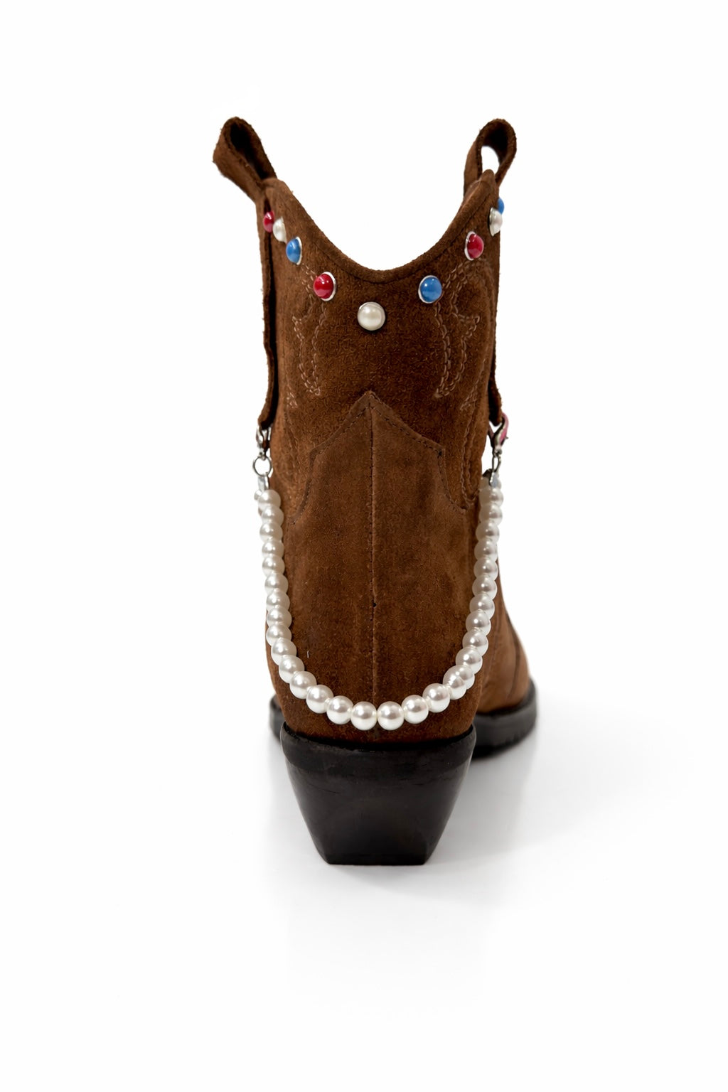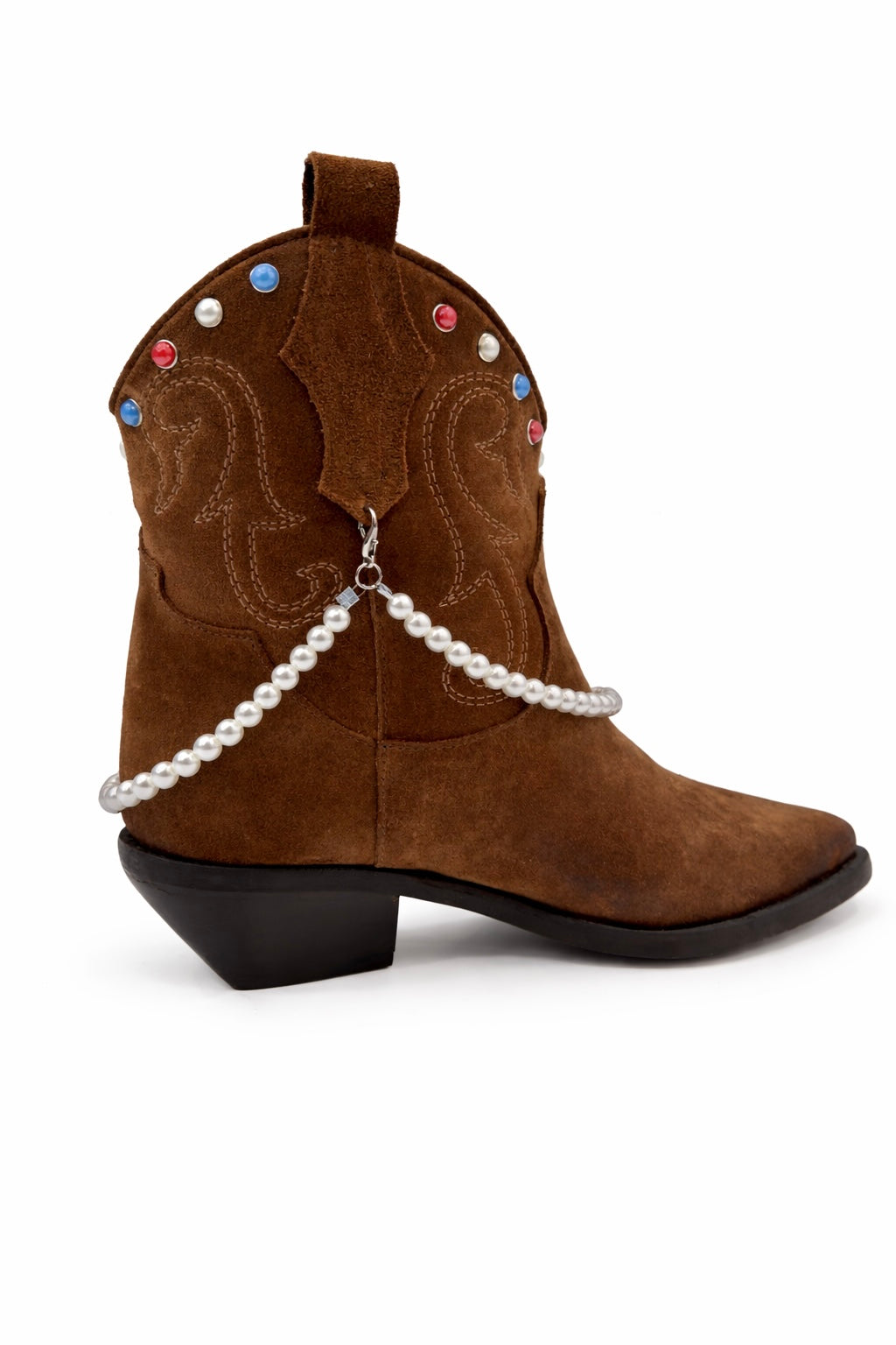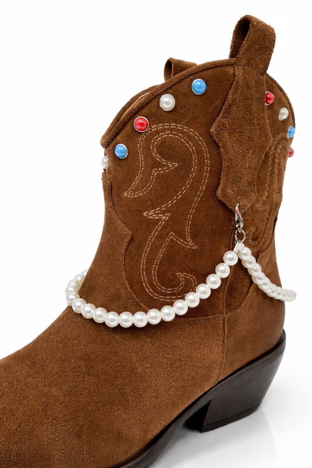 Il vero elemento distintivo è la catena di perle removibile, applicata lateralmente e avvolta delicatamente intorno alla tomaia. Questo dettaglio aggiunge un tocco femminile e prezioso allo stile western, trasformando lo stivale in un accessorio fashion capace di elevare qualsiasi look.